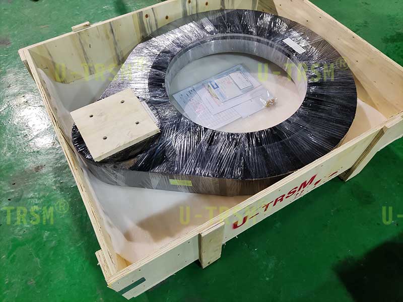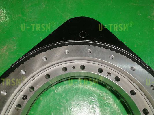 S-III-O-0555 外齒齒輪式回轉(zhuǎn)驅(qū)動(dòng)應(yīng)用在重型機(jī)械設(shè)備上,用來(lái)轉(zhuǎn)動(dòng)工件,回轉(zhuǎn)驅(qū)動(dòng)載重不大,但是使用中有較大的傾覆力,設(shè)備的安裝空間比較有限,不能使用回轉(zhuǎn)中心直徑大的驅(qū)動(dòng),綜合考慮最終選擇了重載系列的0555這個(gè)型號(hào)。