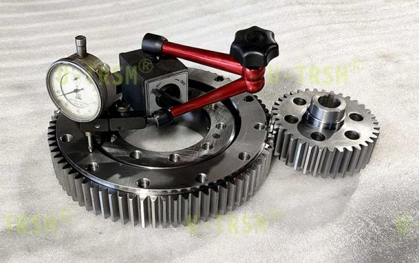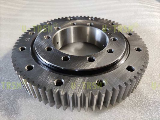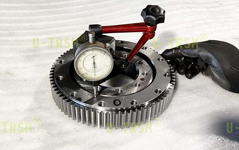 這是型號為011.16.160的精密四點(diǎn)球回轉(zhuǎn)支承及配套小齒輪,客戶用在自動化設(shè)備上。回轉(zhuǎn)支承和齒輪都要求高精度磨齒,并且回轉(zhuǎn)支承要求0游隙,端跳和徑跳要小于等于0.02mm,旋轉(zhuǎn)靈活。最終實(shí)測負(fù)游隙,旋轉(zhuǎn)靈活,端跳、徑跳≤0.015mm。齒輪和回轉(zhuǎn)支承齒圈均達(dá)到6級齒精度要求,完全滿足客戶的使用要求。