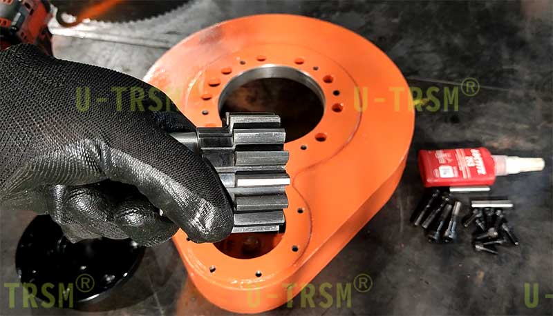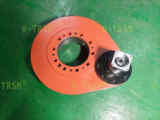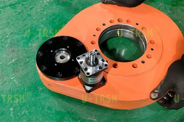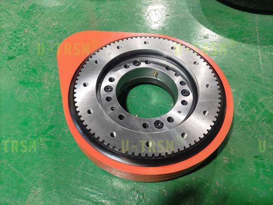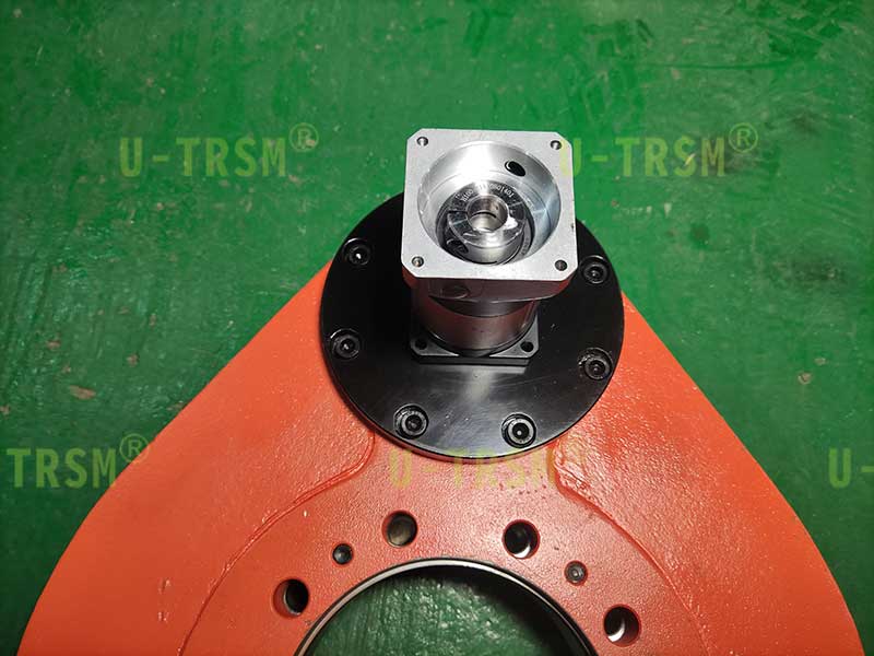 S-I-O-0229 精密直齒回轉(zhuǎn)驅(qū)動(dòng)應(yīng)用在工業(yè)自動(dòng)化設(shè)備上。客戶使用伺服電機(jī)為回轉(zhuǎn)驅(qū)動(dòng)提供動(dòng)力,讓我們配套精密行星減速機(jī),要求齒嚙合圓上的齒間隙≤0.1mm,這也就意味著回轉(zhuǎn)支承的游隙和徑向跳動(dòng)都要做的非常小。