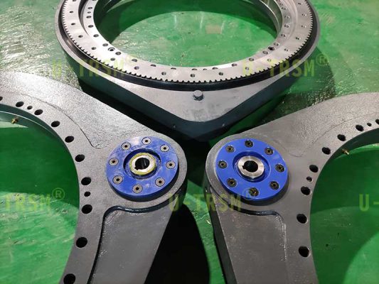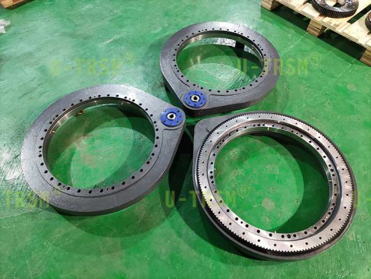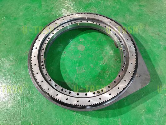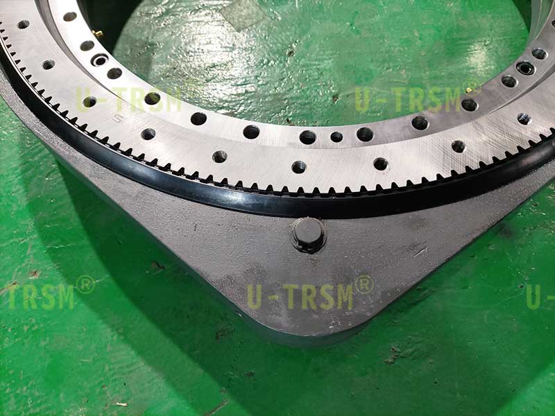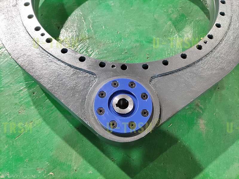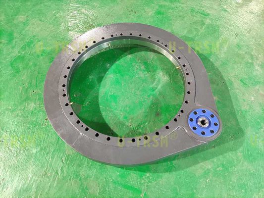 S-I-O-0641齒輪式回轉(zhuǎn)驅(qū)動(dòng)應(yīng)用在自動(dòng)化設(shè)備上,是外齒式的回轉(zhuǎn)驅(qū)動(dòng),用減速電機(jī)帶動(dòng)旋轉(zhuǎn)。減速電機(jī)不是法蘭輸出形式的,減速電機(jī)安裝面與輸出軸承90度分布,受空間限制,不能使用法蘭止口定位,并且法蘭高度必須降低,為了降低法蘭高度,我們采用了特殊設(shè)計(jì),把法蘭高度降到最低,滿足了客戶的使用要求。
