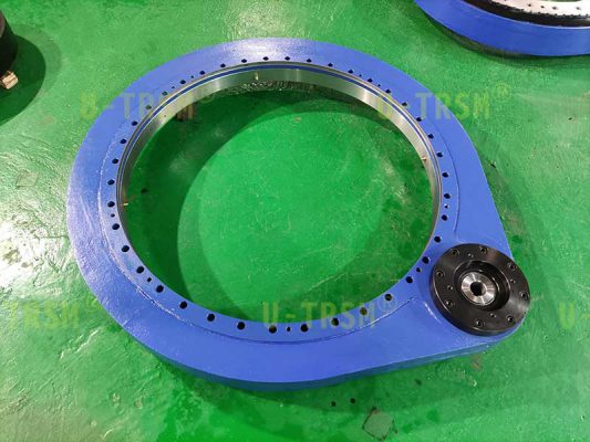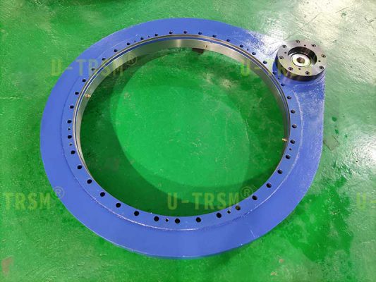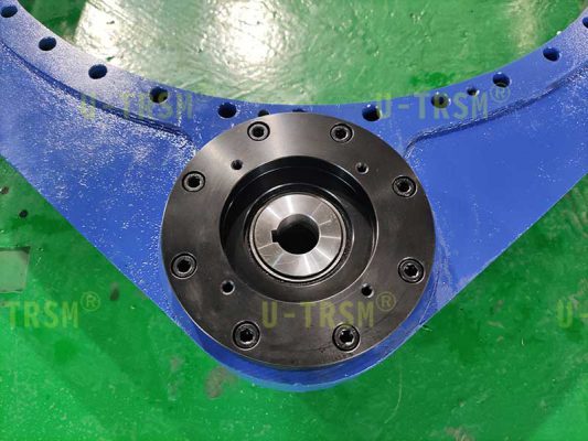 為了達(dá)到需要的減速比,在回轉(zhuǎn)驅(qū)動(dòng)上面又連接了一個(gè)行星減速機(jī),這一套裝置需要用伺服電機(jī)來(lái)驅(qū)動(dòng)。因此,我們?yōu)榭蛻?hù)適配了減速機(jī)的連接法蘭和輸出軸,客戶(hù)可以直接把減速機(jī)連接到回轉(zhuǎn)驅(qū)動(dòng)上使用,非常方便。