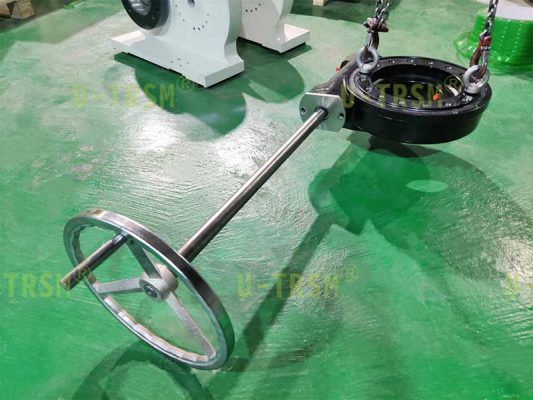 客戶的轉(zhuǎn)臺(tái)尺寸較大,離地高度比較低,如果手輪位置靠近回轉(zhuǎn)驅(qū)動(dòng),操作起來(lái)非常不方便也很不安全,所以我們?cè)O(shè)計(jì)了一根轉(zhuǎn)接軸,把手輪安裝在轉(zhuǎn)臺(tái)外面,這樣既方便操作又安全。