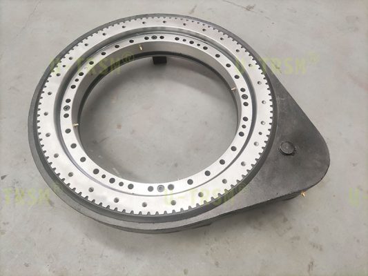 為了讓設(shè)備轉(zhuǎn)動更平穩(wěn)回轉(zhuǎn)驅(qū)動還是采用零游隙,為了精準(zhǔn)控制角度,齒圈和齒輪淬火后磨齒加工,淬火提高齒面硬度,增加扭矩,減少磨損,精度保持更久,磨齒可以保證良好精度?;剞D(zhuǎn)驅(qū)動的輸入端客戶選擇了蝸輪減速機對回轉(zhuǎn)驅(qū)動提供動力,利用渦輪減速機具有機械自鎖這一特點提高設(shè)備整體的安全性。