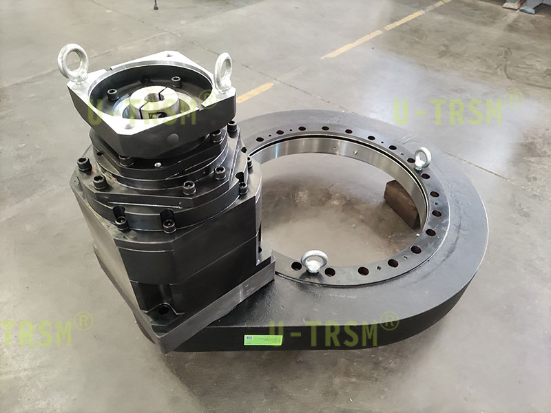 S-Ⅲ-O-0655 精密回轉驅動適配3級200比減速機應用在車間自動生產線上,回轉驅動水平安裝使用,轉速非常低,用來帶動設備的轉臺旋轉固定的角度。