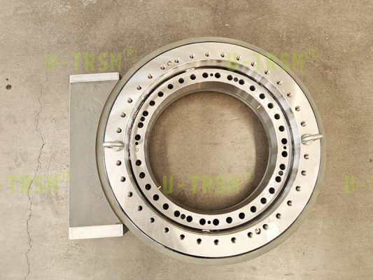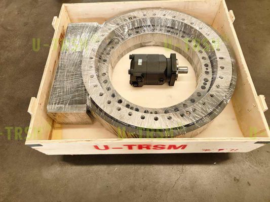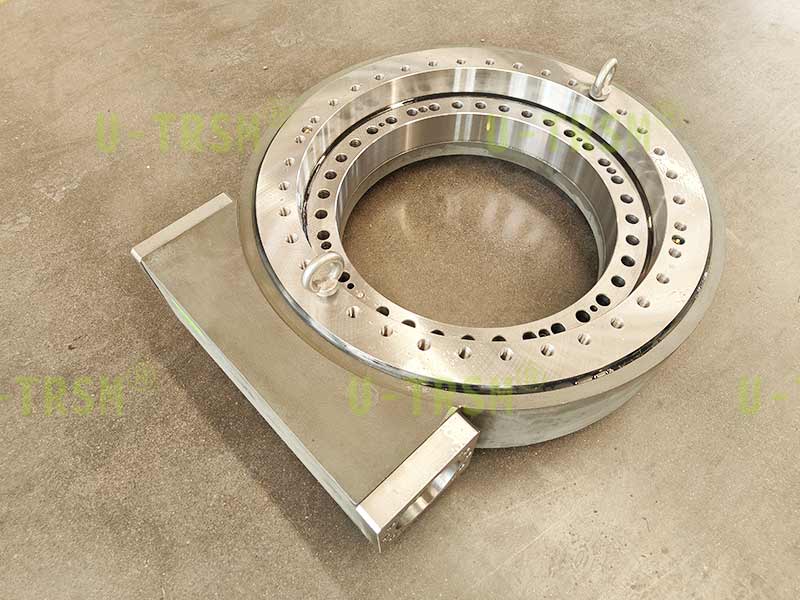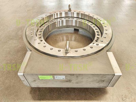 不二傳動設(shè)備(洛陽)有限公司給客戶設(shè)計了一款大模數(shù),大扭矩,豎直安裝使用的蝸輪蝸桿式回轉(zhuǎn)驅(qū)動。該回轉(zhuǎn)驅(qū)動用在大型自動化設(shè)備上,豎直安裝使用,載荷較大,并伴隨很大的傾覆力矩,回程旋轉(zhuǎn)時要求穩(wěn)定平順。經(jīng)過與客戶的多次溝通,不二傳動的設(shè)計師根據(jù)客戶工況,推薦使用蝸輪蝸桿式回轉(zhuǎn)驅(qū)動,并使用大模數(shù)來增加回轉(zhuǎn)驅(qū)動的扭矩,根據(jù)齒承載及力學(xué)性能分析,輸出扭矩可達(dá)近200KNm。