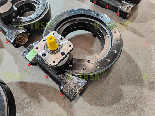 精密14寸回轉(zhuǎn)驅(qū)動配套行星減速機應(yīng)用在特重設(shè)備上,使用特點是轉(zhuǎn)速特別低,需要大的減速比,輸出扭矩要求小,要求精度較高,并且底座和轉(zhuǎn)臺外側(cè)都沒有空間安裝減速機和電機,電機和減速機只能安裝在底座和轉(zhuǎn)臺中間的夾縫中。
